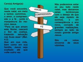 O carta deseja um Feliz Natal ao amigo, que encontre amor, compreensão e fé junto à manjedoura de Jesus, e que Jesus seja exaltado em sua vida e família até seu retorno. Embora não possam estar juntos neste Natal, deixam votos sinceros de sonhos no Natal e grandes realizações no Ano Novo, sempre ao lado de Jesus.