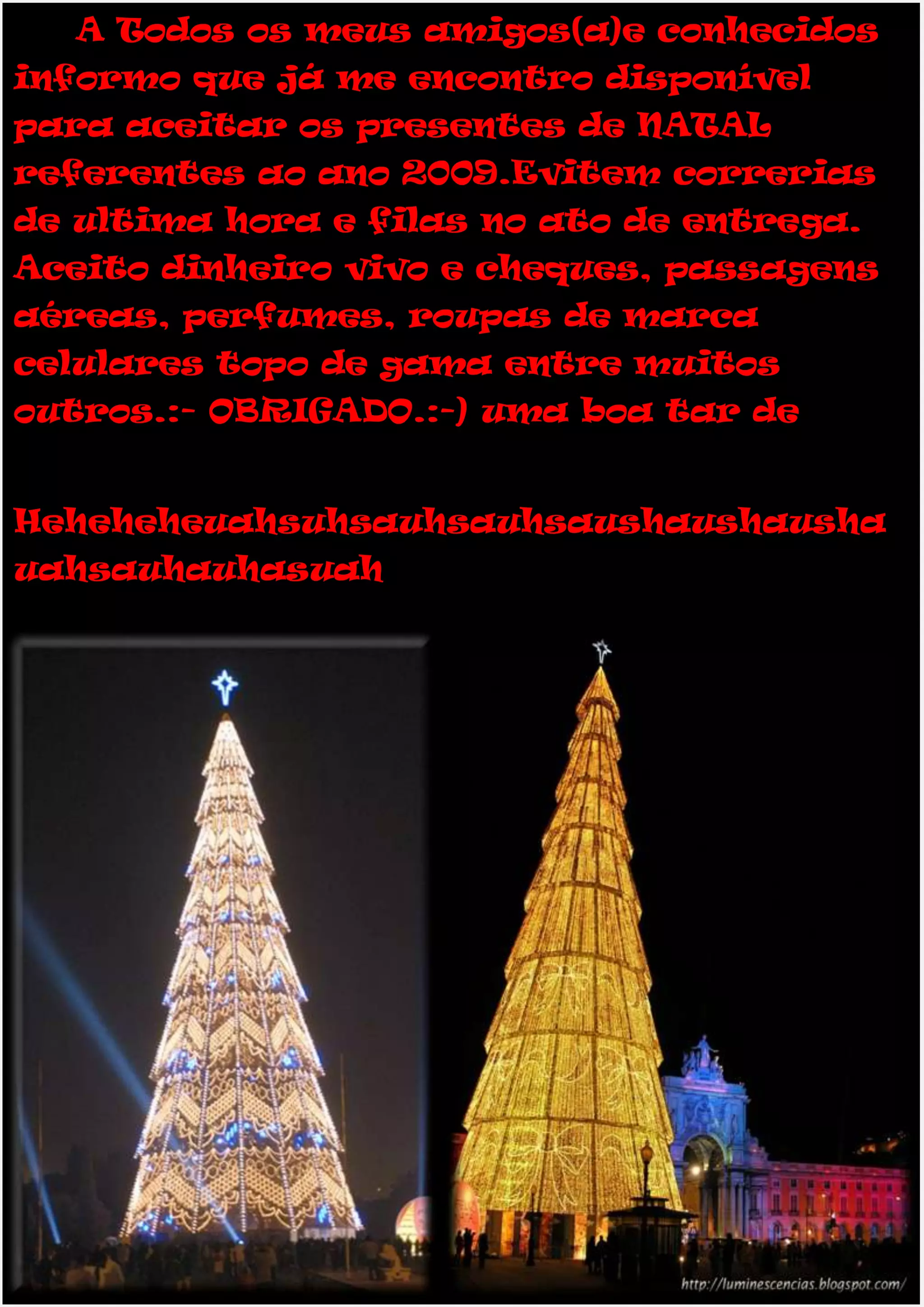 Uma pessoa está solicitando presentes de Natal antecipadamente para o ano de 2009, aceitando dinheiro, cheques, passagens aéreas, perfumes, roupas de marca e celulares caros. A pessoa pede para evitar correrias e filas no ato da entrega dos presentes.