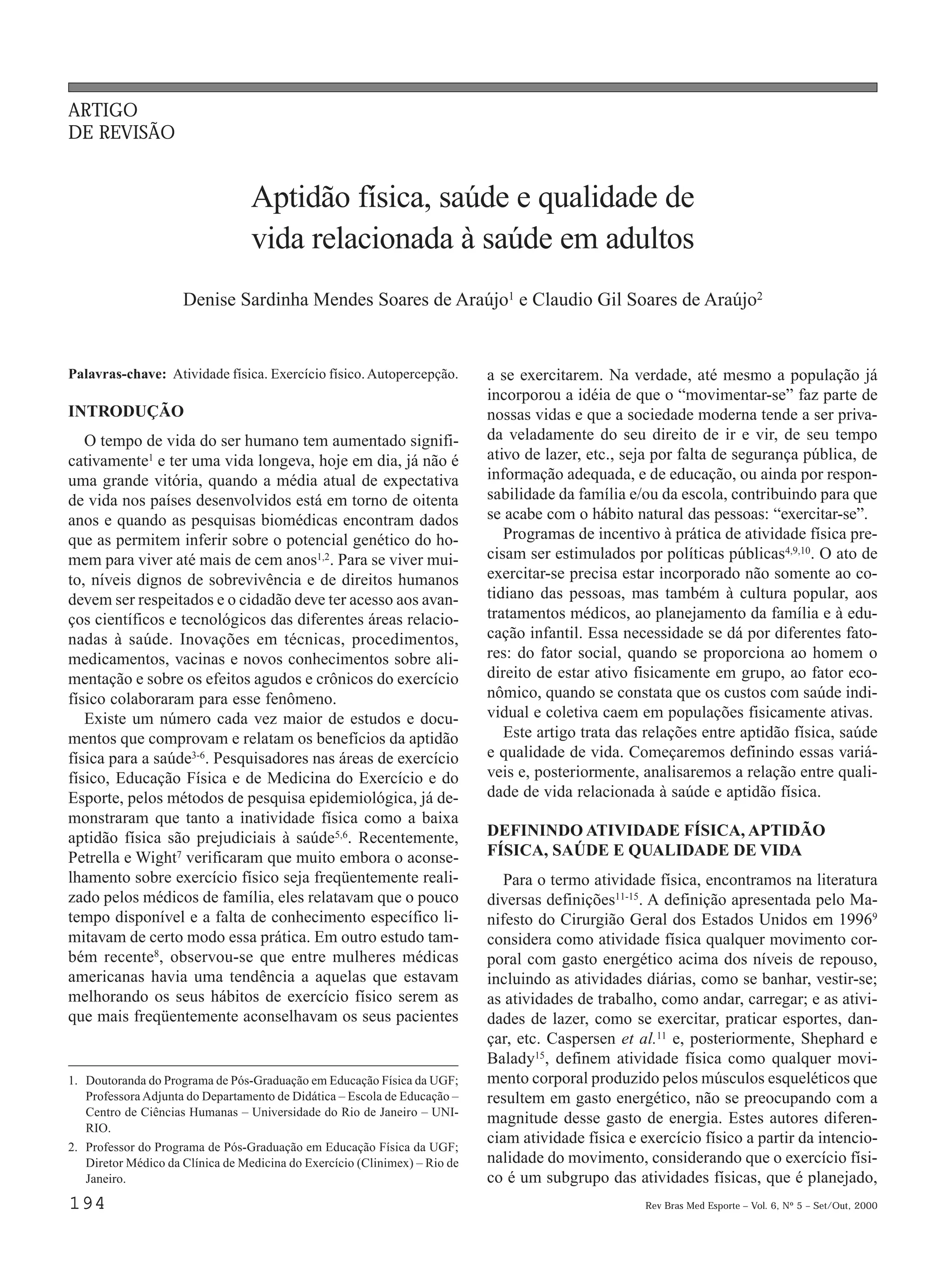 Este artigo discute a relação entre aptidão física, saúde e qualidade de vida relacionada à saúde. Primeiro define os termos chave como atividade física, exercício físico e aptidão física. Em seguida, explica que saúde não é apenas a ausência de doença, mas um estado geral de equilíbrio do indivíduo. Por fim, analisa como a aptidão física está relacionada à qualidade de vida relacionada à saúde.