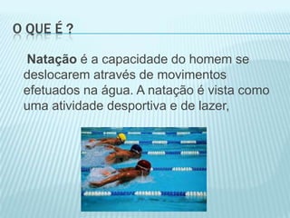 Este documento descreve os diferentes tipos de natação, incluindo crawl, costas, mariposa e bruços. O crawl é o estilo mais rápido, enquanto a mariposa é o mais complicado de executar. Os diferentes estilos envolvem movimentos específicos dos braços e pernas.