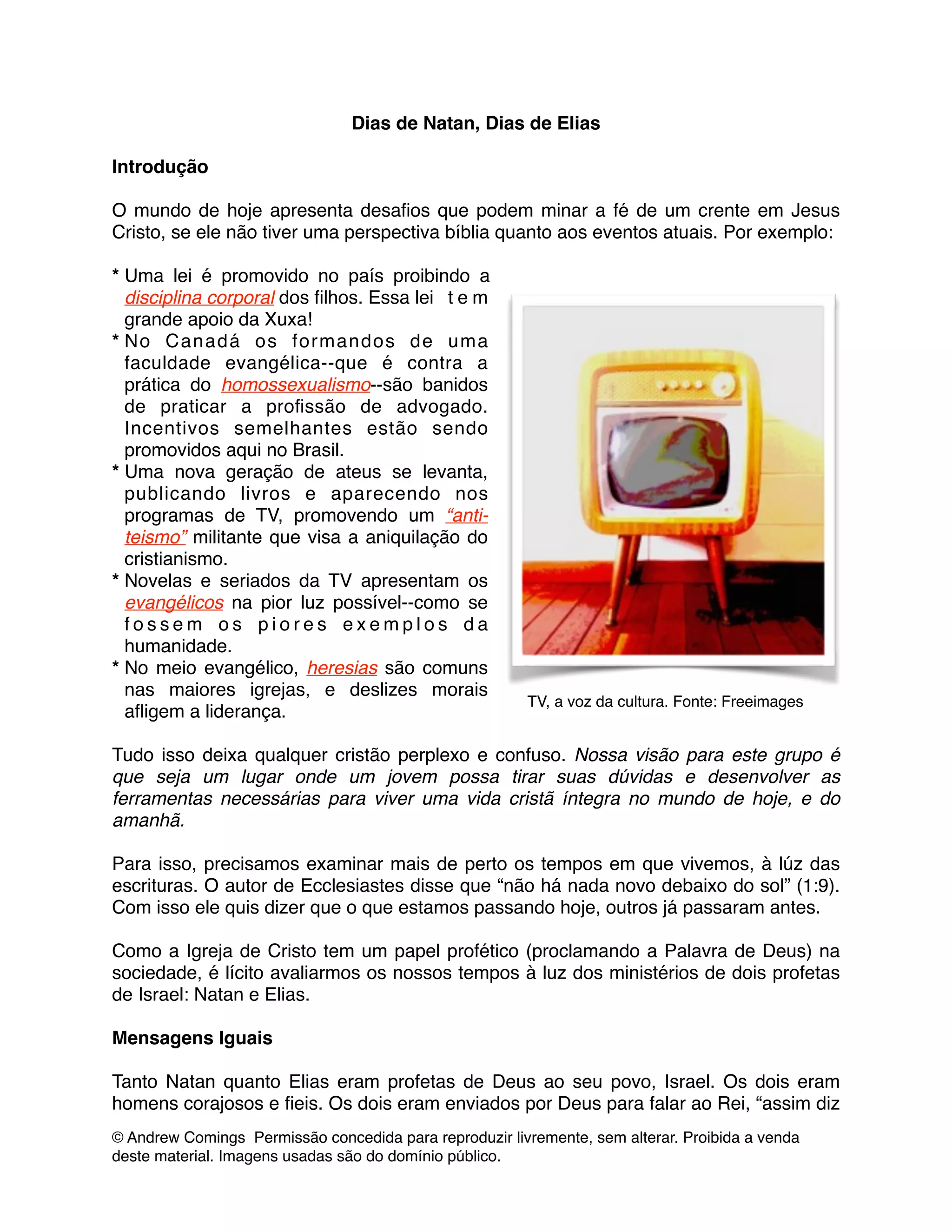 O documento compara os tempos atuais aos dias dos profetas Natan e Elias na Bíblia. Analisa como a Igreja viveu "dias de Natan", com influência na sociedade, e pode estar passando para "dias de Elias", com perseguição. Conclui que os crentes devem se preparar para participar da obra de Deus nos tempos vindouros.
