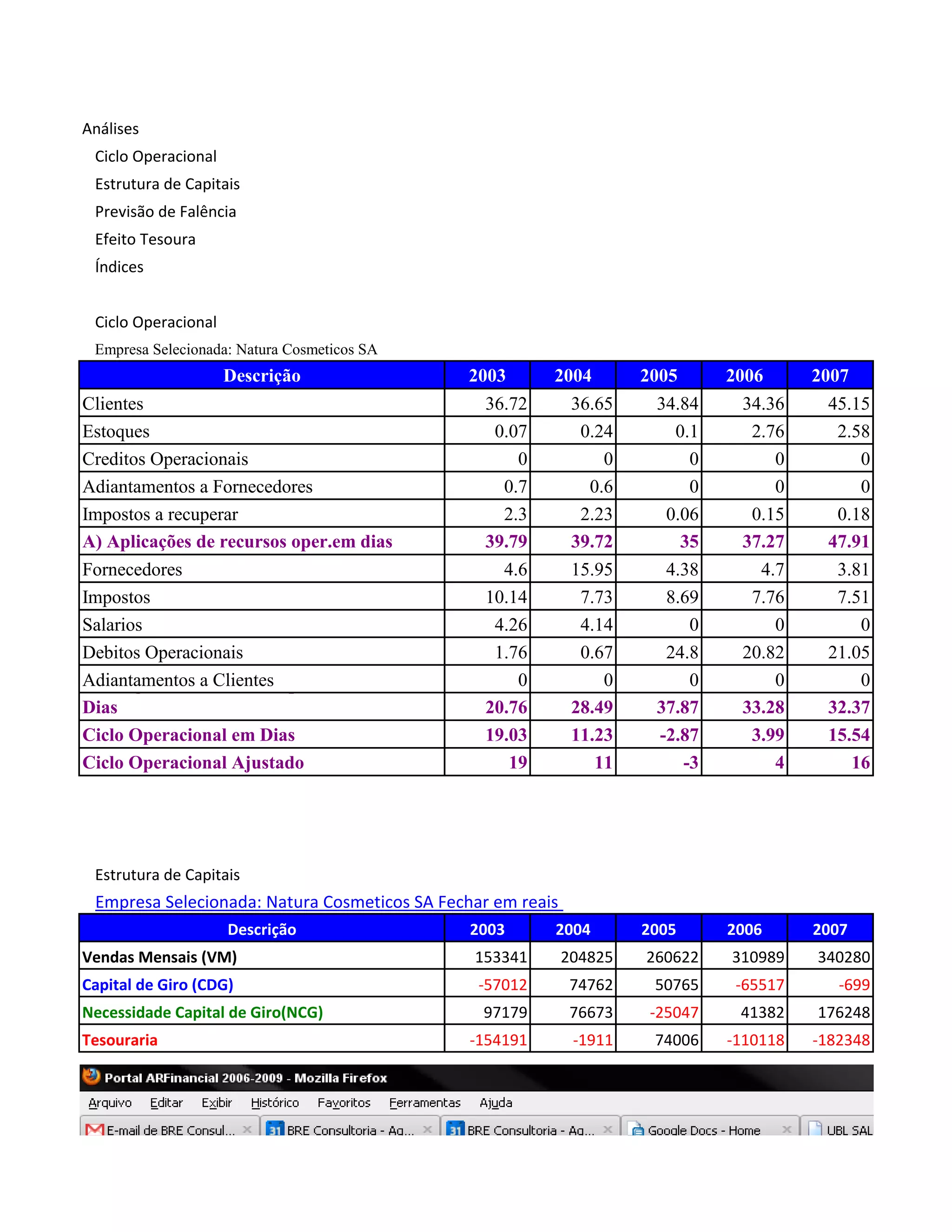 O documento apresenta dados financeiros e índices de liquidez, endividamento, imobilização, lucratividade e dinâmica da empresa Natura Cosméticos de 2003 a 2009. Os dados incluem vendas mensais, capital de giro, necessidade de capital de giro e tesouraria. Os índices calculados são liquidez corrente, liquidez seca, endividamento geral e margens bruta, operacional e líquida.
