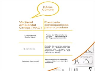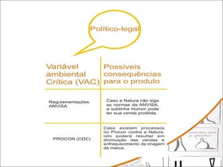 O documento descreve a empresa Natura, sua linha de perfumes Humor e o mercado da Gerência América. A Natura foi fundada em 1969 e atualmente possui 5.000 funcionários no Brasil e 140.100 no exterior. A linha Humor usa humor em sua comunicação para atrair jovens de 18 a 24 anos. Análises mostraram que o mercado alvo da Gerência América é promissor, porém a marca Humor ainda precisa aumentar seu reconhecimento.