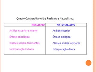 O documento descreve as principais características do Realismo literário, incluindo o objetivismo, universalismo, personagens esféricas, contemporaneidade e detalhismo na descrição. O Realismo também levou ao Naturalismo, que intensificou essas características e adotou o determinismo e cientificismo da época.