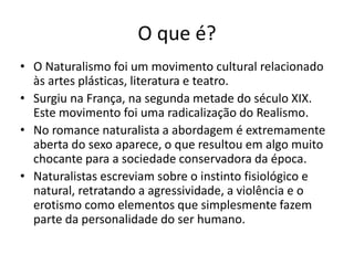O documento descreve o movimento naturalista no Brasil e na França no século XIX. O naturalismo surgiu na França como uma radicalização do realismo e retratava os instintos humanos de forma crua. No Brasil, o naturalismo chegou no final do século XIX e abordou temas como a vida nos cortiços e o preconceito social. Aluísio de Azevedo foi o pioneiro deste movimento no Brasil com obras como O Mulato e O Cortiço.