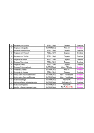 Este documento lista 65 itens com suas respectivas descrições de contas, tipos de contas, classificações e naturezas. As contas estão divididas entre contas de resultado, patrimoniais e retificadoras do patrimônio líquido, e indicam se são devedoras ou credoras.