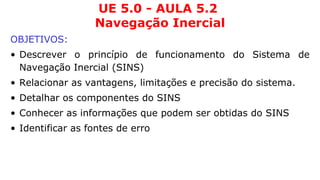 O sistema de navegação inercial mede acelerações para estimar a posição de um veículo, sem depender de sinais externos. Ele usa acelerômetros e giroscópios montados em uma plataforma estabilizada, juntamente com integradores e um computador, para calcular a latitude, longitude, rumo, velocidade e outros parâmetros. Sua precisão se degrada com o tempo devido a erros que se acumulam, requerendo atualizações periódicas por outros meios de navegação.