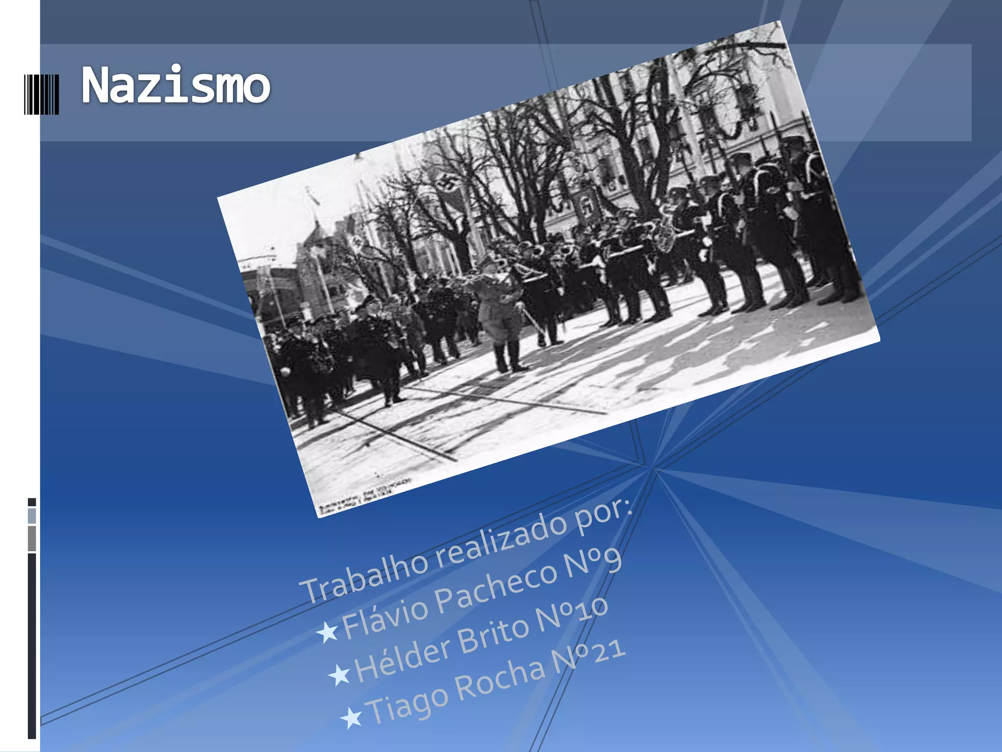 O documento apresenta uma introdução ao nazismo, definindo-o como um sistema totalitário criado por Adolf Hitler na Alemanha entre 1933 e 1945. Explica como surgiu através do Partido Nazista e as ideias de superioridade da raça ariana e espaço vital defendidas por este.