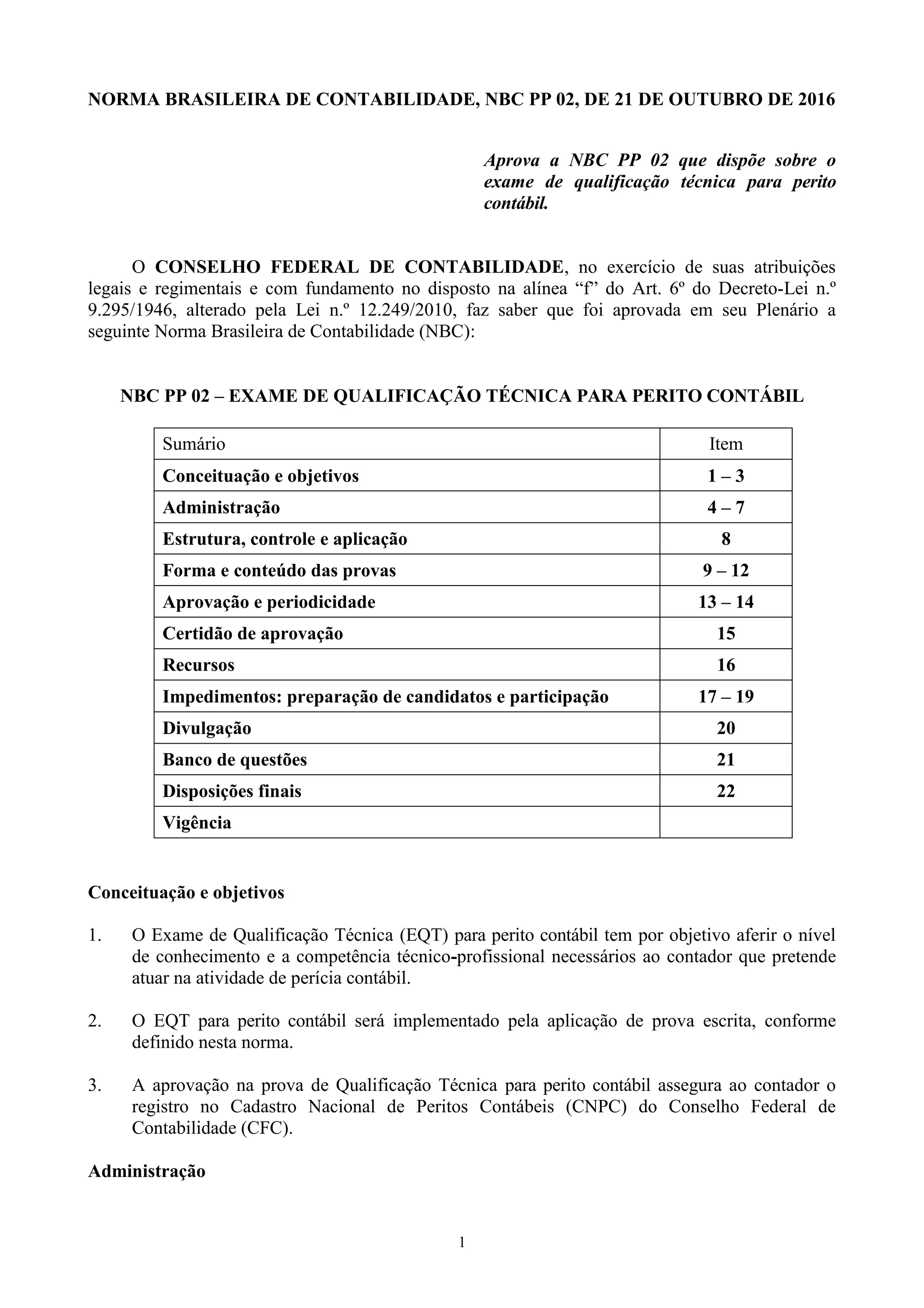 Este documento estabelece as diretrizes para o Exame de Qualificação Técnica para peritos contábeis no Brasil. O exame é administrado por uma Comissão Administradora composta por contadores experientes e tem como objetivo avaliar os conhecimentos necessários para atuar como perito contábil. O exame consiste em questões objetivas e dissertativas cobrindo diversas áreas contábeis e jurídicas. Os candidatos devem acertar pelo menos 60% de cada parte para serem aprovados.