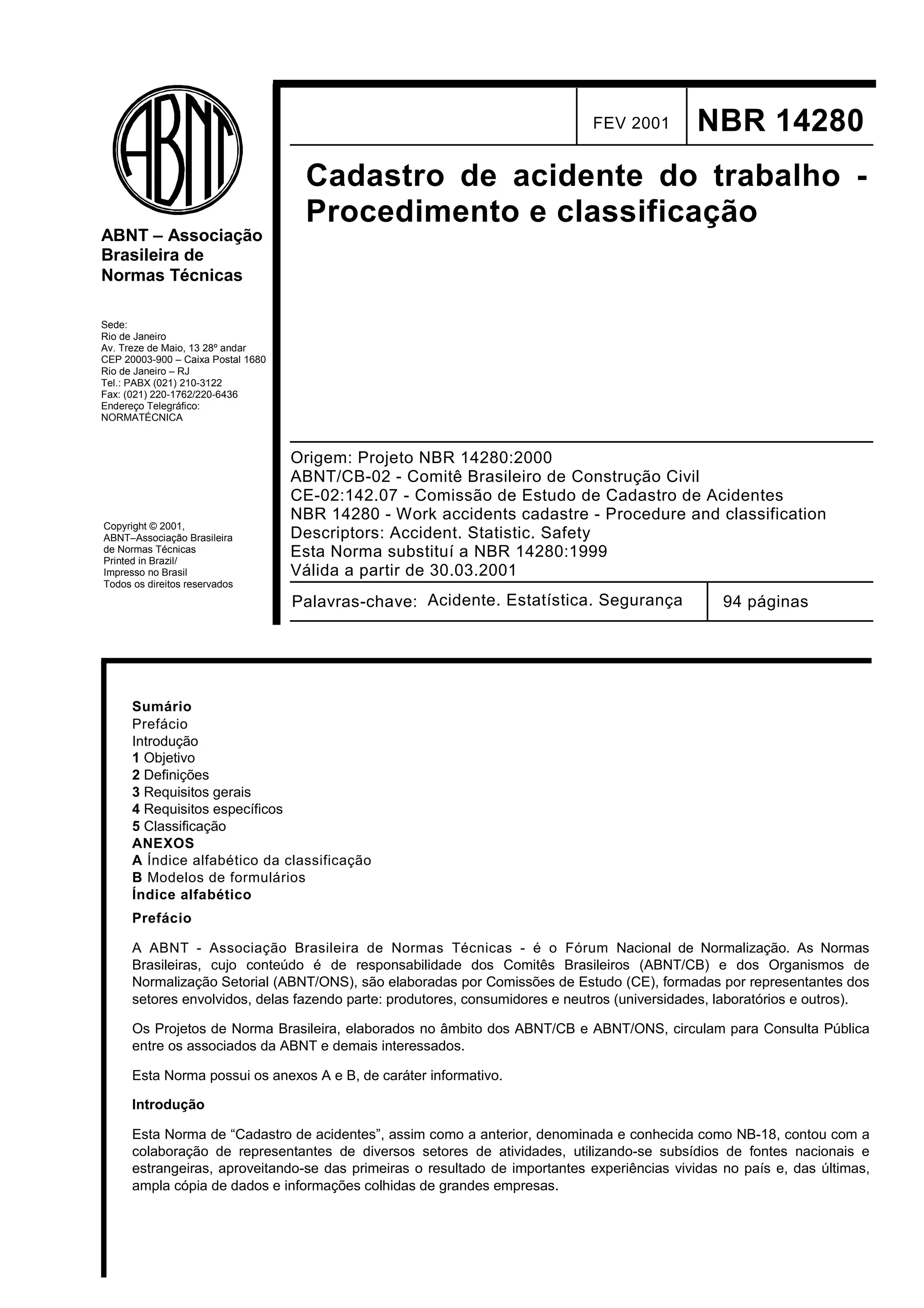 Este documento apresenta a norma técnica brasileira NBR 14280 sobre o cadastro de acidentes do trabalho. A norma estabelece critérios para o registro, comunicação, estatística, investigação e análise de acidentes, causas e consequências. A norma define termos como acidente, lesão, causas e consequências para fins de classificação e estatísticas. A norma tem como objetivo identificar fatos relacionados a acidentes para orientar esforços de prevenção.