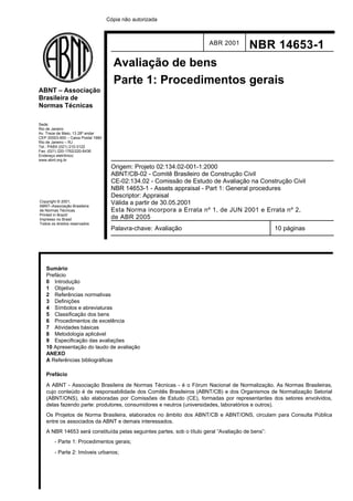 Este documento apresenta as diretrizes gerais para avaliação de bens contidas na NBR 14653-1, definindo seus objetivos, referências normativas, termos técnicos, classificação de bens, atividades básicas e requisitos para laudos de avaliação. A norma estabelece padrões para a realização de avaliações técnicas de bens tangíveis e intangíveis no Brasil.