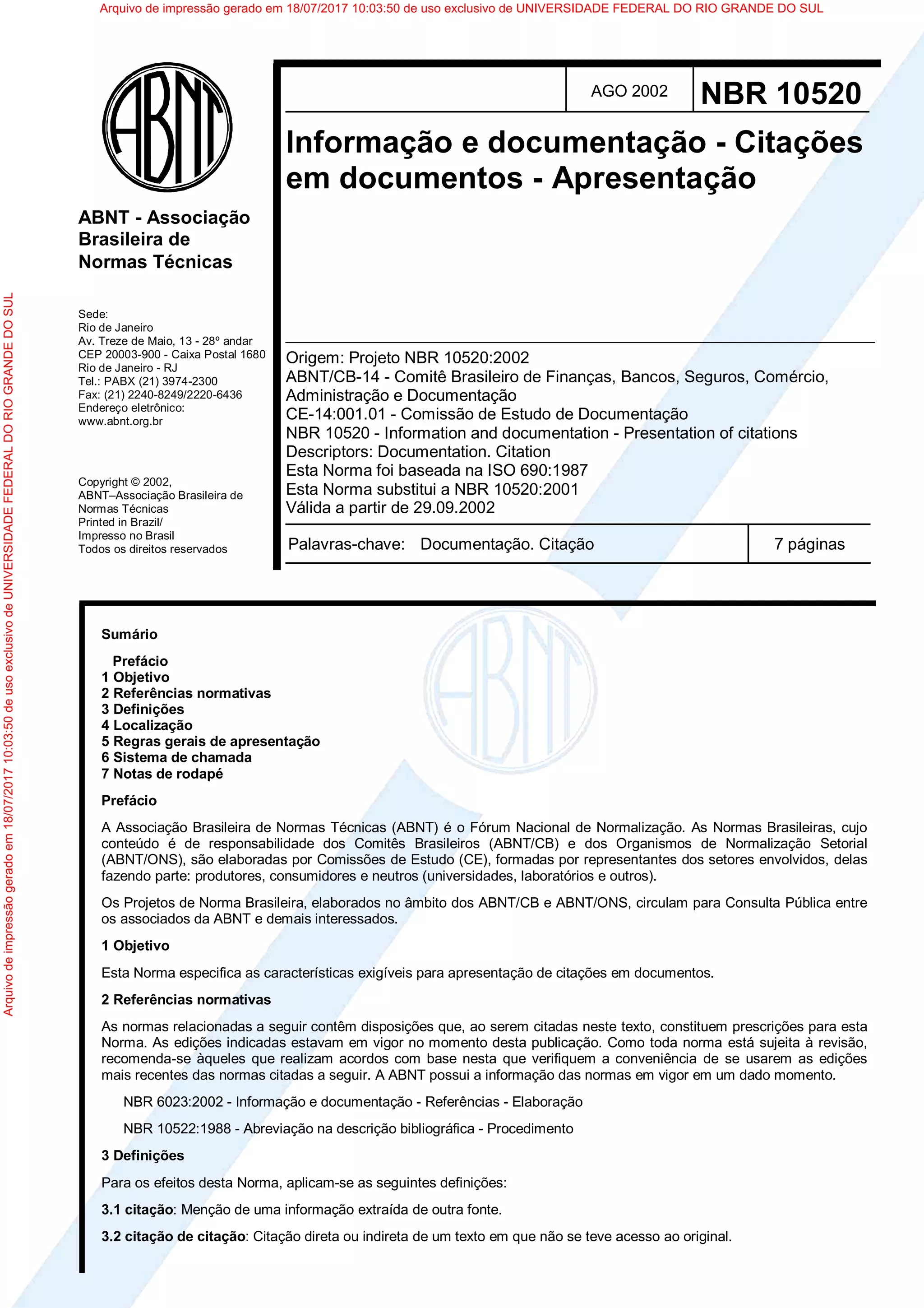 Este documento apresenta as regras para citações em documentos de acordo com a NBR 10520, especificando (1) o objetivo de fornecer características para apresentação de citações, (2) as referências normativas utilizadas e (3) definições de termos como citação direta e indireta.