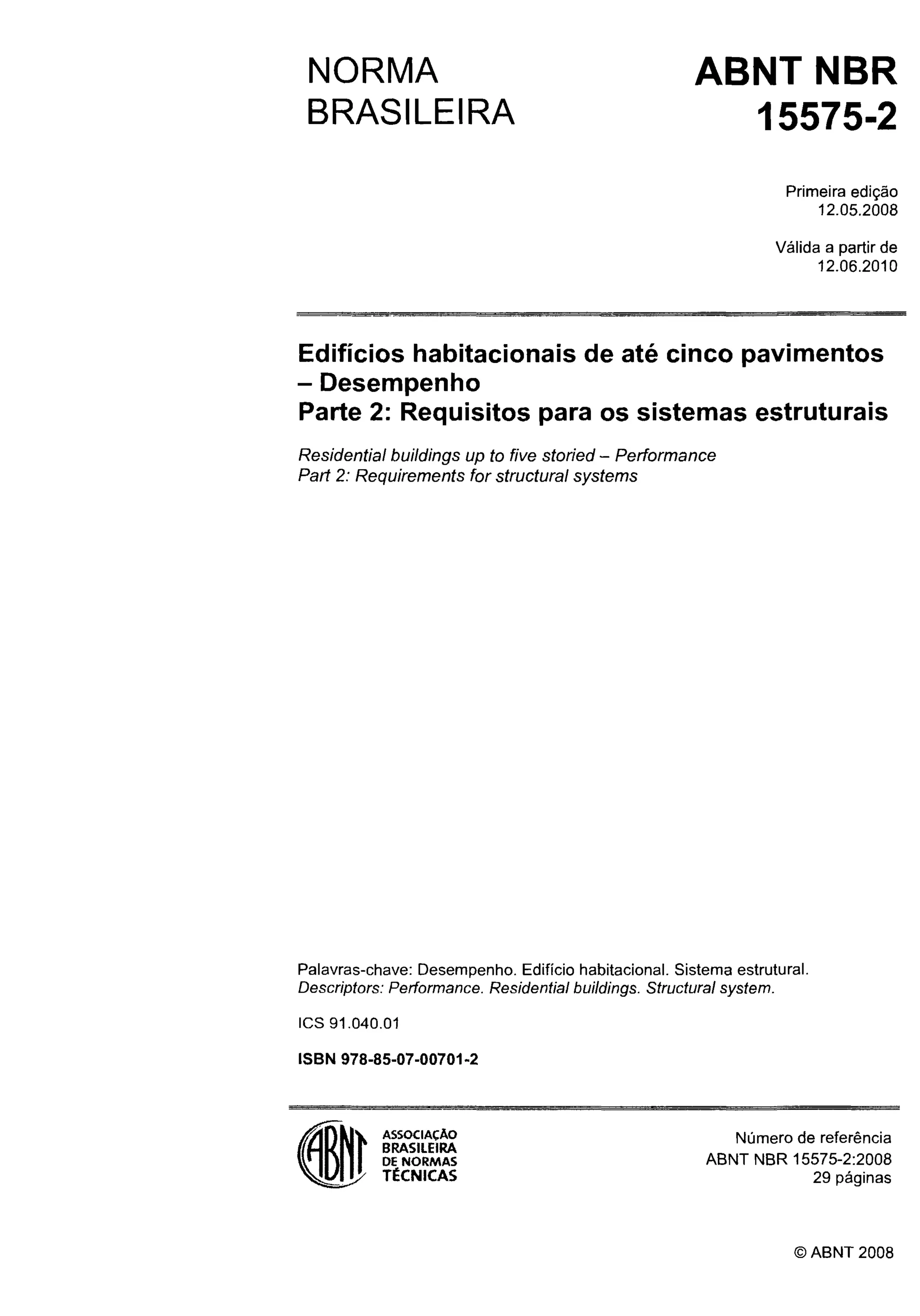Este documento estabelece requisitos e critérios de desempenho para sistemas estruturais de edifícios habitacionais de até cinco pavimentos, considerando os estados-limites último e de serviço. Inclui requisitos de segurança estrutural, resistência, deformações, impactos, durabilidade e manutenção do sistema estrutural.