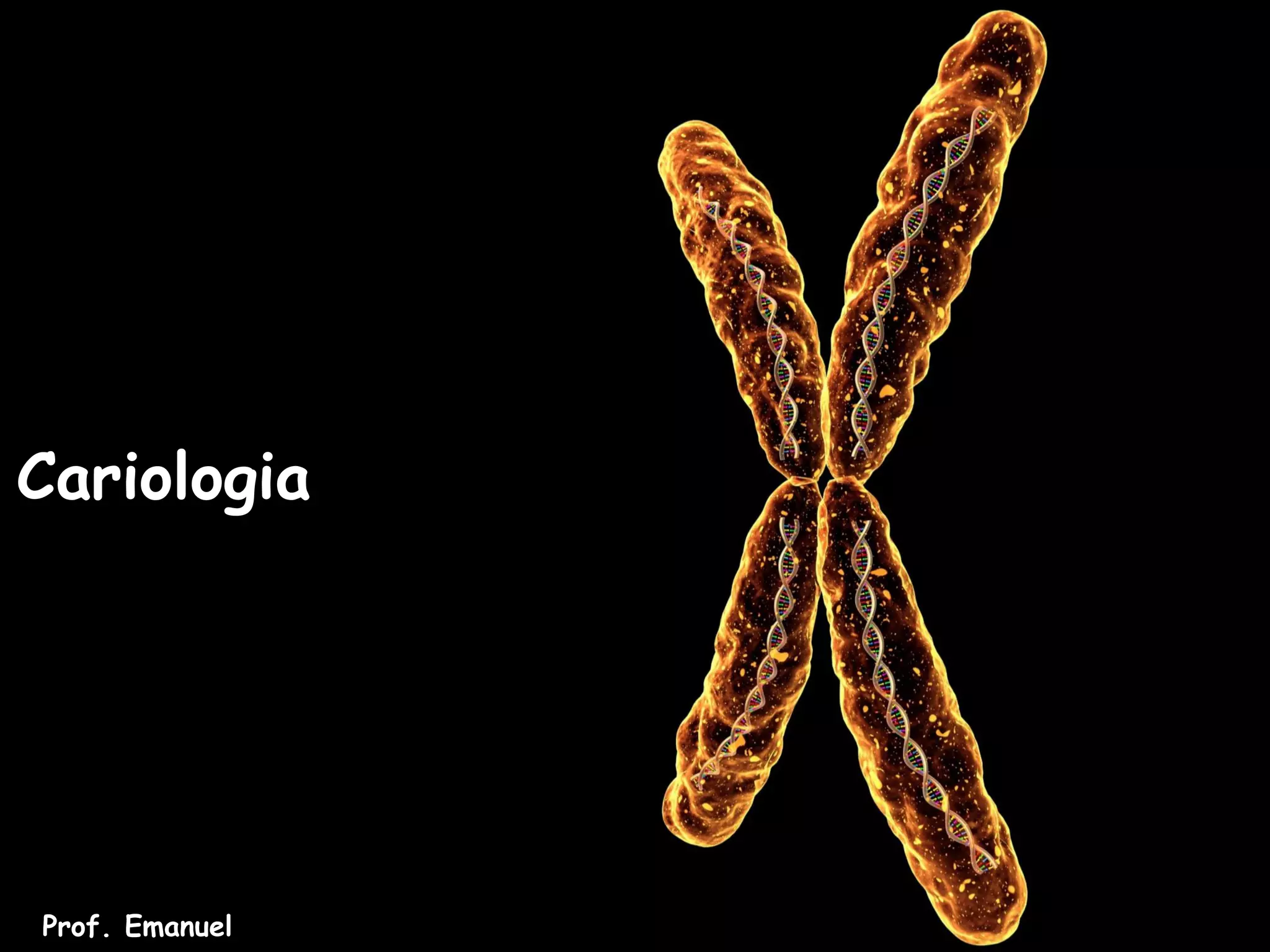 O documento discute os principais componentes do núcleo celular durante a interfase, incluindo a carioteca, cariolinfa, nucléolo e cromatina. Também aborda a estrutura e função dos cromossomos, número de cromossomos nas células, realização da cariotipagem e exemplos de síndromes cromossômicas.