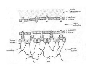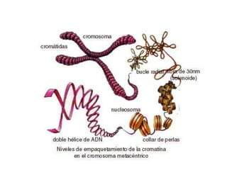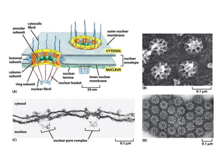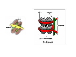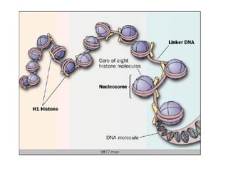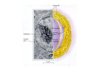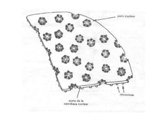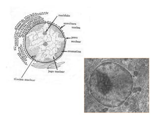 O documento descreve as características do núcleo celular, incluindo sua estrutura e componentes durante a interfase. O núcleo contém a maior parte do DNA da célula e controla seu metabolismo. Ele é formado pelo envoltório nuclear, matriz, nucleoplasma, nucléolos e cromatina. A cromatina é composta por DNA e histonas e pode estar em forma condensada (heterocromatina) ou não (eucromatina).