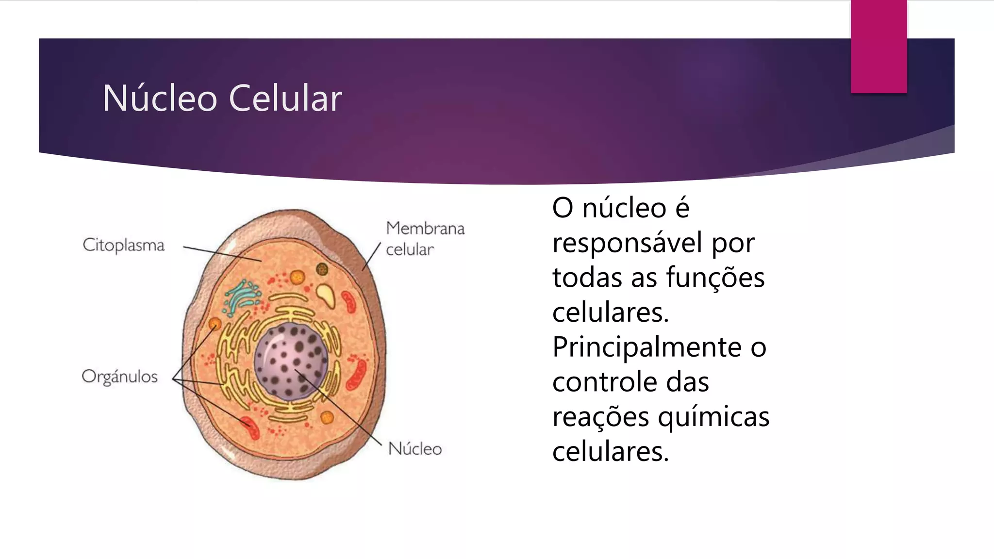 O documento descreve as principais estruturas e funções do núcleo celular, incluindo a carioteca, nucleoplasma, nucléolo, cromossomos e cromatina. O núcleo contém o material genético na forma de DNA e controla as atividades e reações químicas da célula.