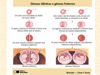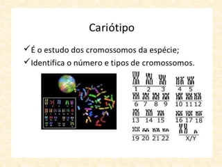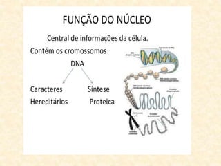 O documento discute o núcleo celular, cromossomos e DNA. Explica que o núcleo contém o DNA e controla as funções celulares. Discutem os cromossomos sexuais X e Y e como determinam o sexo. Também explica as diferenças entre células somáticas e gaméticas em termos de número de cromossomos.