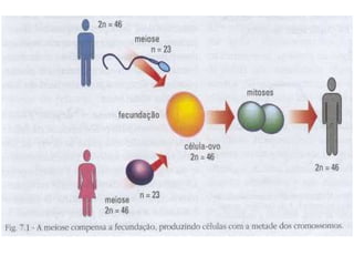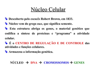 O documento descreve a estrutura e componentes do núcleo celular. O núcleo contém o material genético da célula no formato de DNA enrolado em cromossomos. O DNA se duplica antes da divisão celular e os cromossomos se formam a partir da condensação da cromatina. Células humanas normais contêm 46 cromossomos em pares.