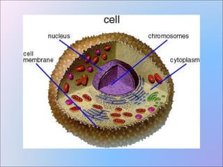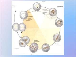 O documento descreve os principais componentes do núcleo celular e as etapas do ciclo celular, incluindo a interfase e a mitose. Discorre sobre a estrutura do DNA e dos cromossomos, o processo de replicação do material genético, e as diferenças entre células somáticas e células-tronco.