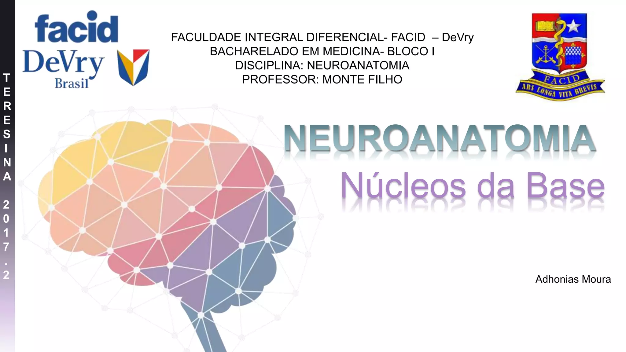 O documento discute os núcleos da base do cérebro, incluindo sua localização, funções e implicações em distúrbios. Os principais núcleos da base mencionados são o núcleo caudado, putâmen, globo pálido, núcleo accumbens e núcleo de Meynert. O documento também descreve o circuito motor dos núcleos da base e como distúrbios nesse circuito podem causar condições como Parkinson.