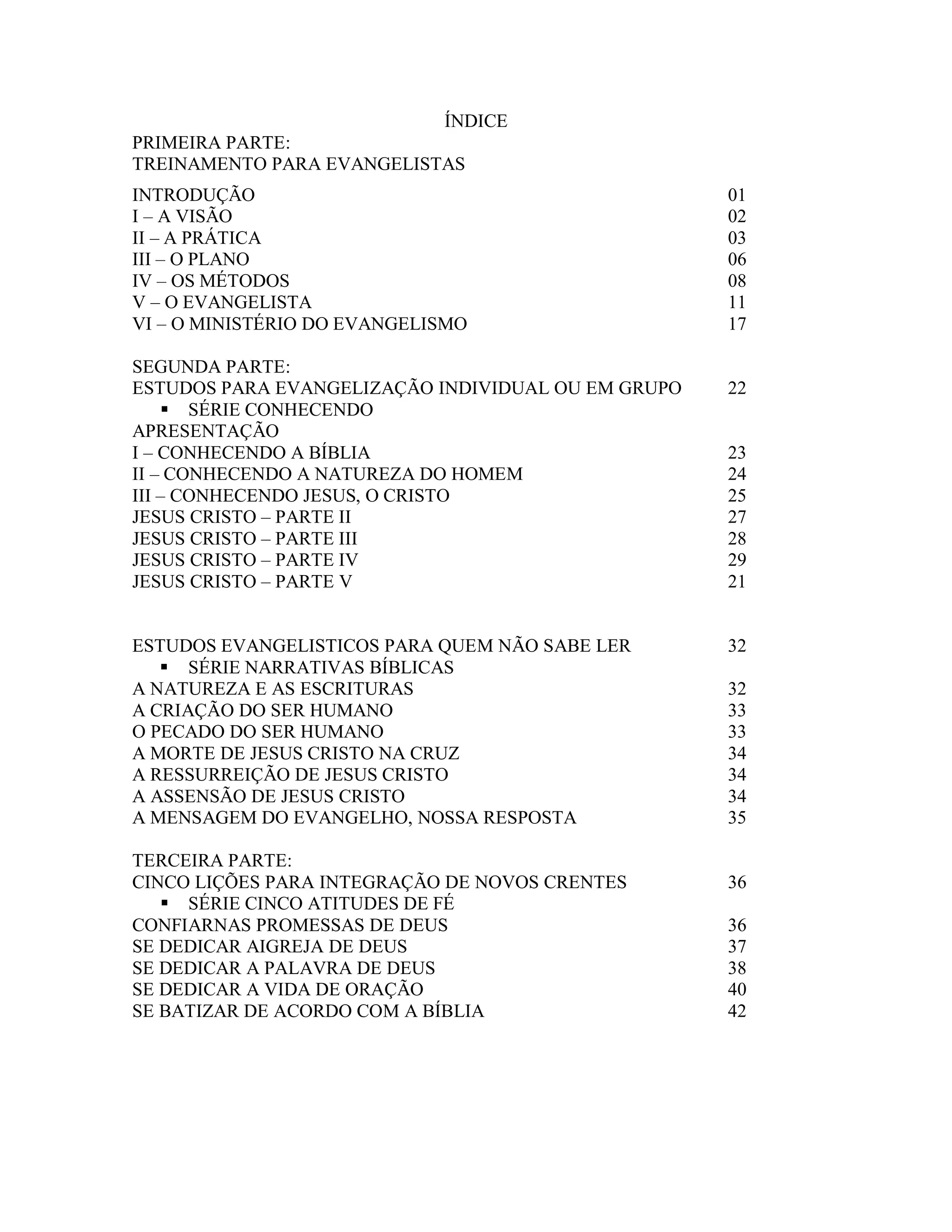 Este documento fornece um plano de treinamento para evangelizadores dividido em três partes. A primeira parte discute a visão, prática, métodos e ministério do evangelismo. A segunda parte apresenta estudos bíblicos individuais e em grupo para evangelização. A terceira parte apresenta cinco lições para integrar novos crentes à igreja.