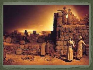1) O documento resume a história de Israel desde a aliança de Deus com Abraão até a destruição de Jerusalém pelos babilônios. 2) Fala sobre o período após o cativeiro quando os judeus começaram a retornar à terra sob a liderança de Zorobabel, Esdras e Neemias. 3) Introduz a história de Neemias, que orou fervorosamente a Deus sobre a situação em Jerusalém e recebeu permissão do rei da Pérsia para reconstruir os muros da c