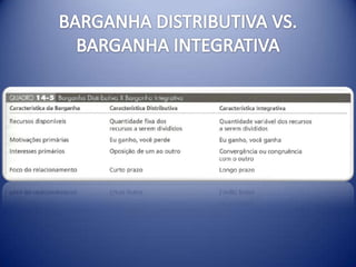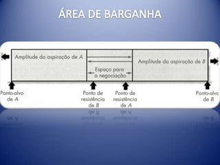 O documento discute os conceitos de negociação e conflito, as estratégias de barganha integrativa e distributiva, os papéis de terceiros em negociações e como fatores culturais influenciam o processo. É destacado que a preparação, regras claras e ofertas/contraofertas são essenciais para um acordo benéfico para ambas as partes.