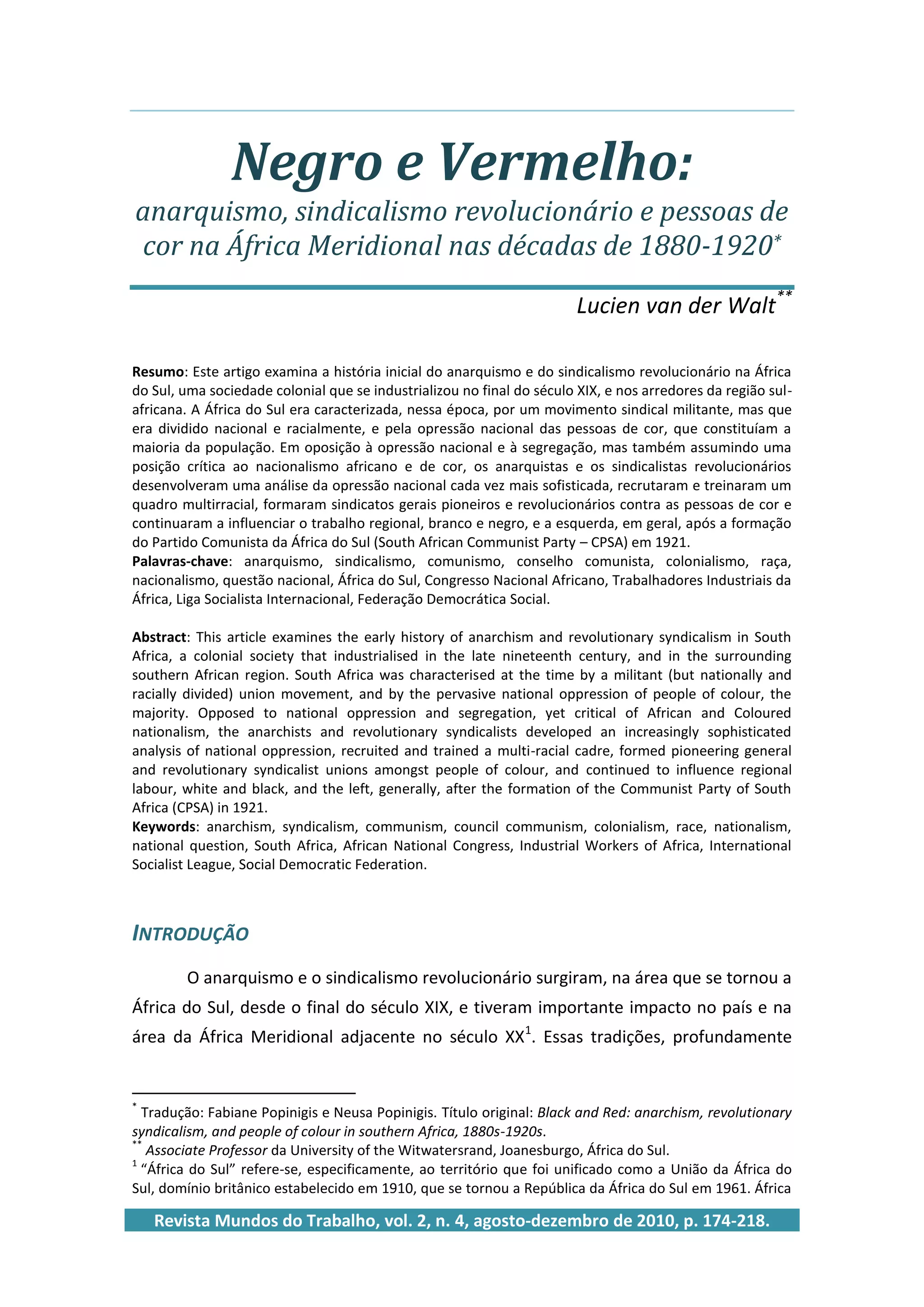 1) O anarquismo e o sindicalismo revolucionário surgiram na África do Sul no final do século XIX e influenciaram o país e a região da África Meridional ao longo do século XX.