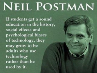 O documento discute as ideias do teórico Neil Postman no livro "Amusing Ourselves to Death" sobre como a política, jornalismo, educação e religião se submetem às demandas do entretenimento na era da televisão, degradando o discurso público racional. Postman argumenta que a televisão educa crianças para gostarem dela, não havendo tempo para explicar nada complexo, e que o entretenimento se tornou o centro da cultura. Embora de 1985, as ideias permanecem atuais com o uso de computadores, tablets