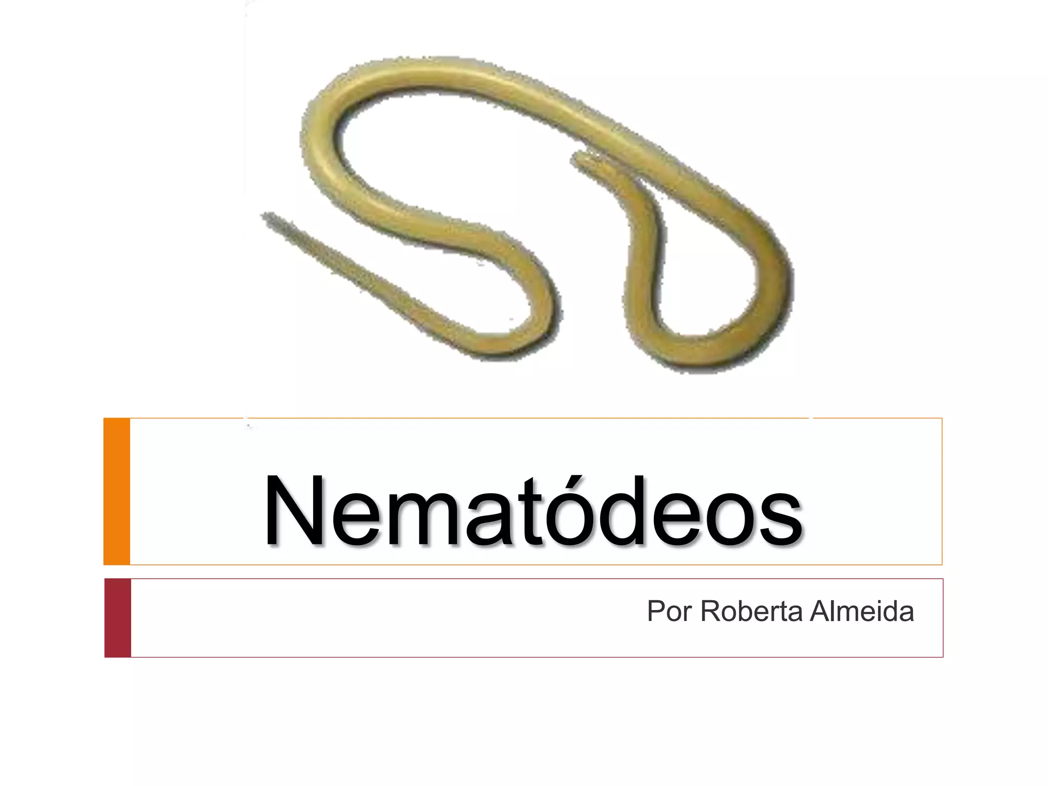 Nematódeos são vermes cilíndricos que podem viver livremente ou ser parasitas. Eles possuem corpos alongados e cilíndricos, sistema digestório completo, e pseudoceloma entre dois cilindros musculares. Alguns parasitas comuns incluem lombriga, ancilóstomo e filária. A maioria é dioica com reprodução sexuada interna e ovos com casca resistente.