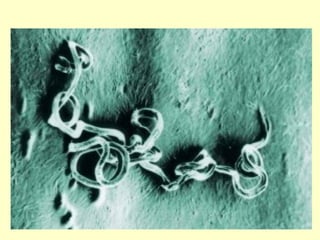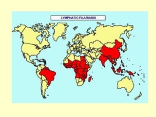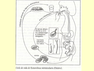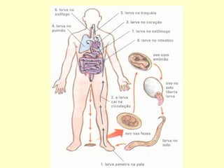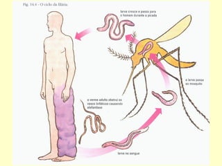 O documento descreve os nematelmintos, um filo de vermes com cerca de 90.000 espécies. São encontrados na água, solo e como parasitas de animais e vegetais. Algumas espécies importantes causam doenças como ascariase, ancilostomose e filariose, caracterizadas por sintomas como anemia, hipertrofia de membros e elefantíase.