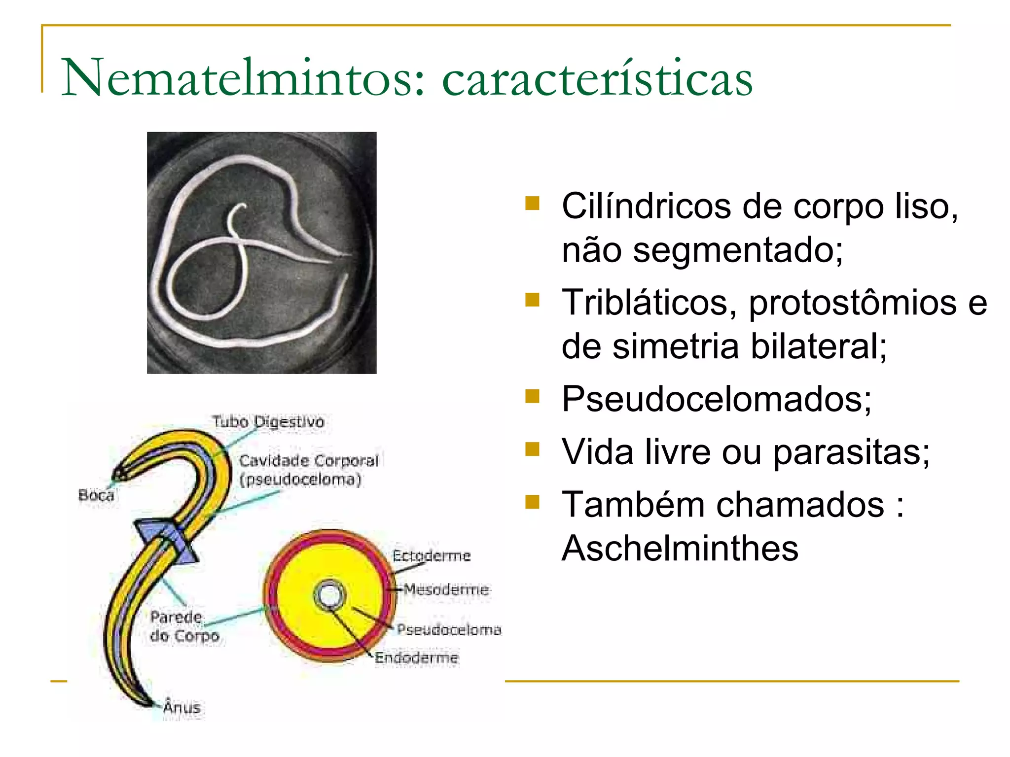 Nematelmintos são vermes cilíndricos, não segmentados e parasitas. Possuem cutícula externa, sistema digestivo completo, respiração e excreção por difusão, sistema nervoso em anel ao redor do esôfago e reprodução sexuada. Ascaridíase é causada pela lombriga Ascaris que contamina via ovos ingeridos e larvas que perfuram os pulmões. Ancilostomose é causada por Ancylostoma e Necator que perfuram o intestino e causam anemia. O