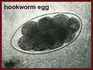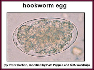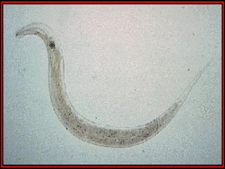 O documento descreve vários parasitas que afetam os seres humanos, incluindo ascaris, ancilostomose, larva migrans, filariose e oxiurose. Ele fornece detalhes sobre o ciclo de vida, sintomas e métodos de prevenção de cada parasita.