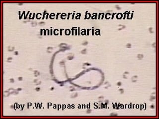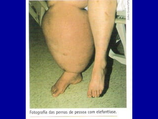 Filariose ou ElefantíaseWuchereria bancrofti (filária) Habita os vasos linfáticos dos braços, mamas saco escrotal e principalmente pernas. É comum migrarem para os capilares sanguíneos da pele, de onde são sugadas pelo inseto Contaminação: picada do inseto do gênero Culex ( hospedeiro intermediário) contaminado Prevenção: tratar os doentes e combate ao vetor