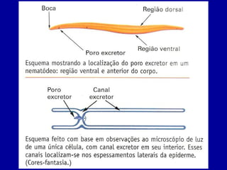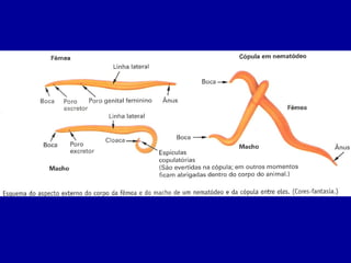 Nematelmintos Eumetazoários TriblasticosPseudocelomados Simetria bilateral Respiração Cutânea Excreção: difusão e Renetes Sistema circulatório ausente Reprodução - machos mais curtos e com ganchos com os quais seguram as fêmeas durante a cópula. Possuem as espículas peniais, que são protraídas e introduzidas na fêmea durante a cópula