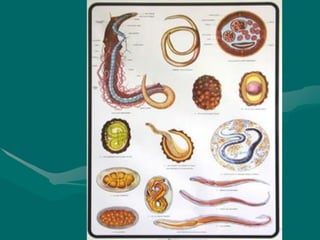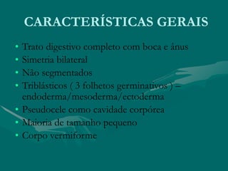 O documento descreve as características gerais dos nematoides, incluindo seu trato digestivo completo, simetria bilateral, pseudocele como cavidade corpórea e tamanho pequeno. Os nematoides incluem parasitas importantes como Ascaris que afetam humanos, animais e plantas, e se reproduzem internamente depositando ovos.