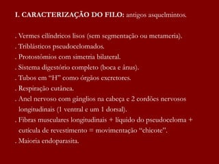 O documento descreve o filo Nemathelmintes, incluindo sua caracterização como vermes cilíndricos sem segmentação. Detalha cinco tipos de endoparasitas humanos: 1) Áscaris, que causa ascaridíase através da ingestão de ovos e tem ciclo de vida no intestino e órgãos humanos; 2) Ancilóstomo, que causa ancilostomose através da pele e tem ciclo no sangue e intestino; 3) Filária, transmitida por mosquitos e causa elefantíase; 4)