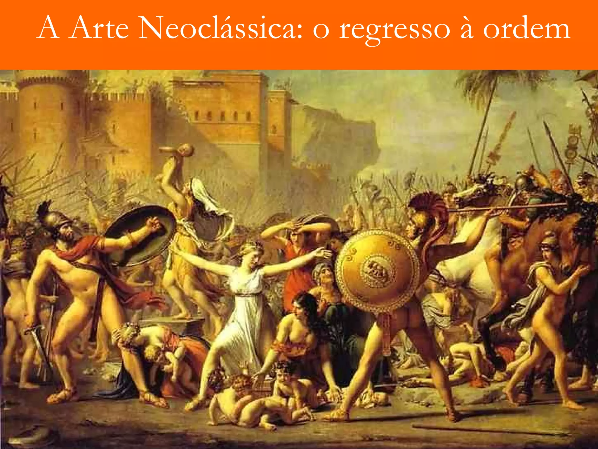 O documento descreve a arte neoclássica, um movimento que se desenvolveu na Europa entre 1750-1830. Teve origem na França e Inglaterra como uma reação ao Rococó e uma busca pela simplicidade e ordem inspirada na arte greco-romana antiga.