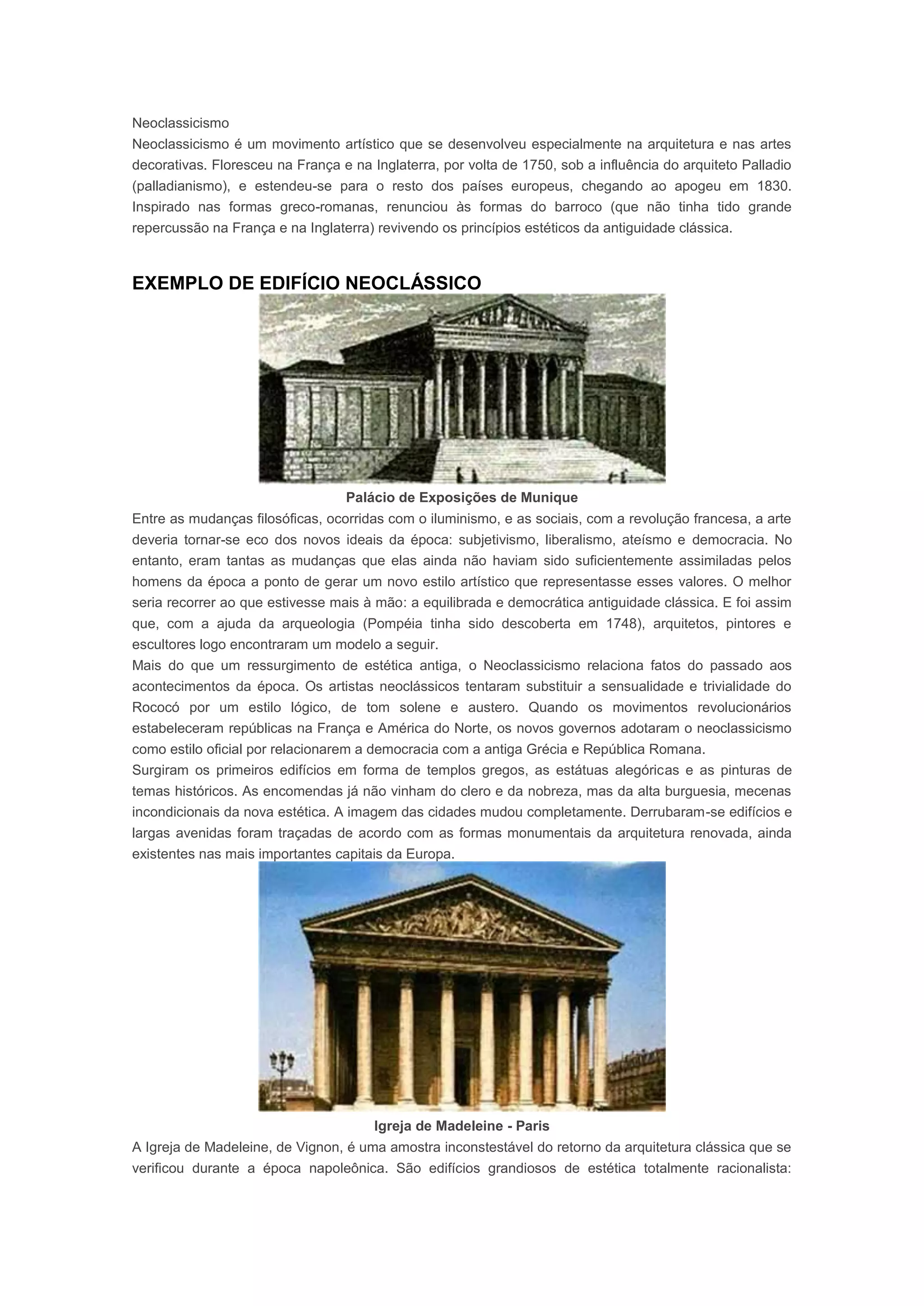 O movimento neoclássico surgiu na Europa no final do século XVIII como uma reação ao Barroco e ao Rococó. Inspirado na simplicidade e equilíbrio das formas clássicas da Grécia e Roma antigas, o Neoclassicismo se destacou na arquitetura, escultura e pintura com temas históricos, mitológicos e alegóricos e buscou a racionalidade e o academicismo nas artes.
