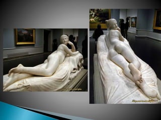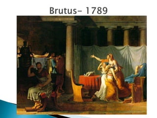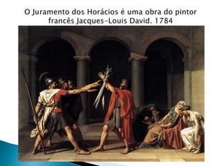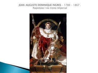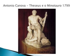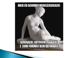 O documento descreve o movimento neoclássico na arte, que se desenvolveu na Europa entre os séculos 18 e 19. Teve como base os ideais do iluminismo e se caracterizou pelo formalismo, racionalismo e volta aos estilos clássicos da Grécia e Roma antigas. Destaca os principais artistas deste período como Jacques-Louis David e Antonio Canova, notadamente em suas obras de pintura e escultura.