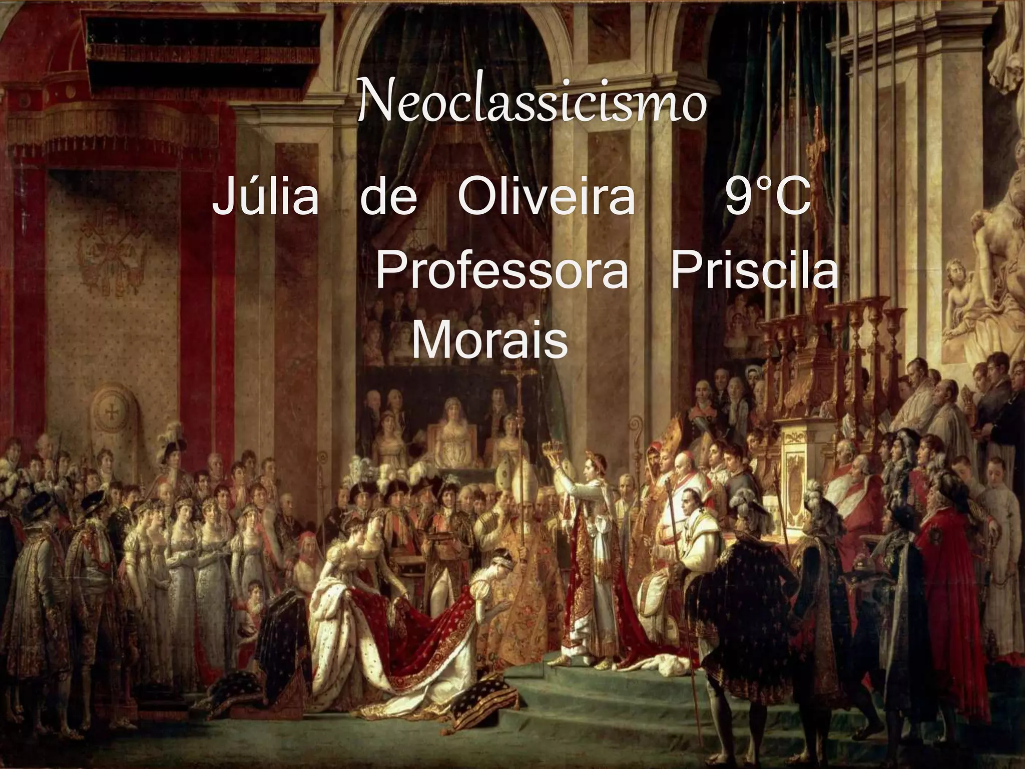 O neoclassicismo foi um movimento artístico entre 1755-1830 que buscava retomar os estilos greco-romanos. Priorizava proporção, nobreza e clareza na pintura, com traços mais importantes que cores. Na arquitetura e escultura usava elementos clássicos como colunas. Artistas como David, Ingres e Canova criaram obras seguindo esses princípios.
