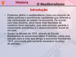 1) O neoliberalismo surgiu na década de 1970 com base nas ideias de Milton Friedman e defende a não intervenção do Estado na economia e livre mercado.