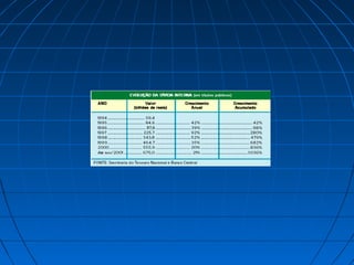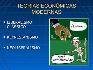 O documento discute as teorias econômicas liberais clássicas, keynesianas e neoliberais. Apresenta os principais conceitos e características dessas teorias, como a defesa do livre mercado no liberalismo clássico e a intervenção estatal no keynesianismo. Também descreve o surgimento do neoliberalismo como reação ao estado de bem-estar social, pregando cortes de gastos públicos, privatizações e desregulamentação da economia.