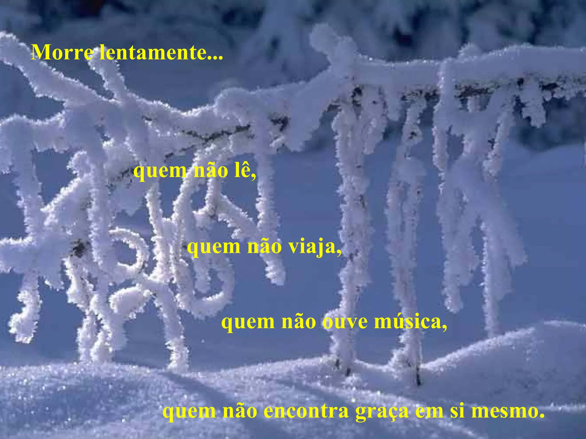 Este poema discute como viver plenamente e evitar "morrer lentamente" por meio de hábitos repetitivos e falta de riscos, aventura e paixão. Ele sugere que as pessoas devem ler, viajar, ouvir música, expressar seus sentimentos, tentar coisas novas, seguir seus sonhos e se permitir ser feliz para evitar uma vida sem graça.