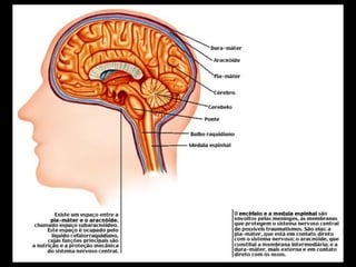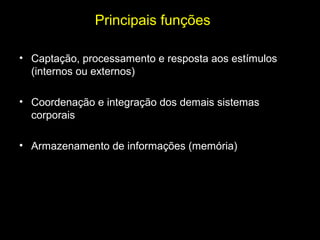 O sistema nervoso é dividido em três partes principais e é responsável por captar estímulos, processar informações e coordenar os sistemas corporais. É composto por neurônios, células da glia e células de Schwann. Inclui também os órgãos dos sentidos como visão, audição, olfato, paladar e tato.