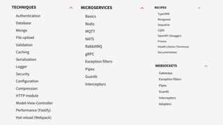 O documento explora o NestJS, um framework para desenvolvimento de aplicações backend em Node.js, enfatizando sua produtividade, performance e escalabilidade. Apresenta informações sobre suas camadas, controladoras, serviços, testes e a compatibilidade com JavaScript puro e TypeScript. Além disso, fornece links úteis para documentação e recursos adicionais relacionados ao NestJS.