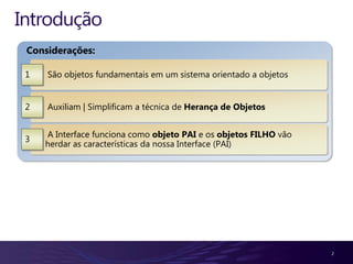 Interfaces são fundamentais em sistemas orientados a objetos, pois simplificam a herança de objetos ao funcionarem como objetos "pai", permitindo que objetos "filho" herdem suas características. Sem interfaces, códigos podem ser duplicados e despadronizados, enquanto interfaces garantem padronização. O exemplo mostra como criar um projeto com classes PessoaFísica e PessoaJurídica implementando interfaces comuns de negócio e modelo.
