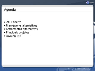 O documento discute alternativas de código aberto à plataforma Microsoft .NET, incluindo frameworks como Mono e DotGNU, ferramentas como SharpDevelop e MonoDevelop, e projetos populares mantidos pela comunidade como CMS e frameworks de mapeamento objeto-relacional. Também aborda a capacidade de rodar código Java no .NET usando o IKVM.NET.