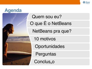 O documento apresenta o NetBeans como uma IDE essencial, destacando suas funcionalidades e vantagens, como ser gratuito, multiplataforma e ter suporte a diversas linguagens. Foram listados 10 motivos para usar o NetBeans, incluindo facilidade de uso, suporte a padrões de mercado e extensibilidade. Também menciona oportunidades para estudantes e desenvolvedores na comunidade NetBeans.