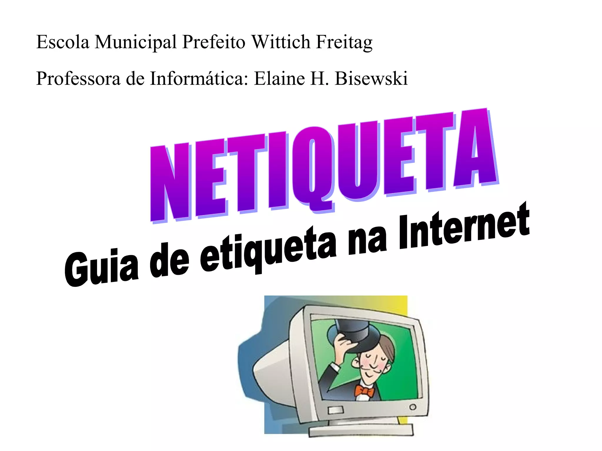 O documento fornece dicas sobre etiqueta na internet, incluindo o uso de acrônimos em bate-papos, símbolos para expressar emoções, pensar antes de postar, boas maneiras ao enviar e-mails e os campos principais de cabeçalhos de e-mail.
